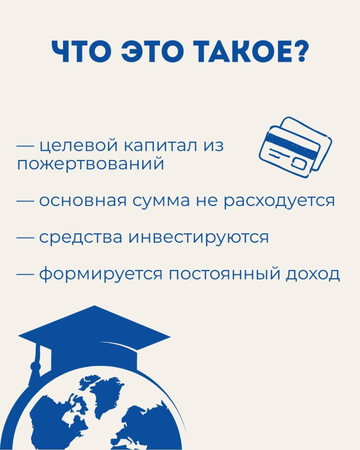 Эндаумент — это современный и устойчивый инструмент поддержки университетского сообщества, который успешно работает в ведущих мировых и российских вузах. Его суть проста: сформированный целевой капитал сохраняется и приумножается, а доход от него направляется на развитие университета.