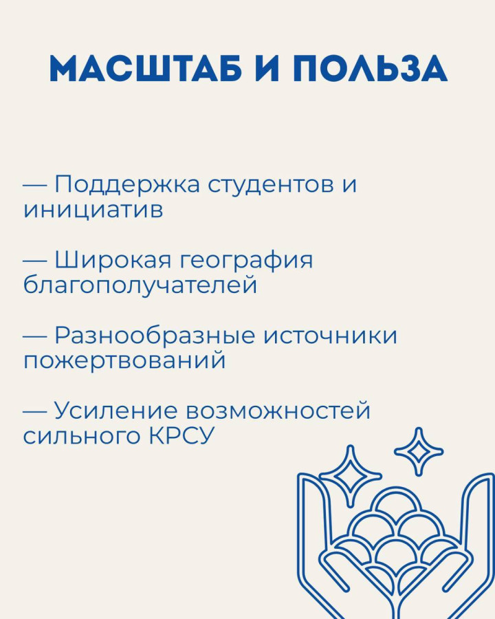 Участие в эндаумент-фонде — это не разовая помощь родной alma mater, а долгосрочная инвестиция в качество образования, науку и человеческий капитал. Средства эндаумента позволяют поддерживать талантливых студентов и преподавателей, развивать лаборатории, образовательные программы, научные проекты и инфраструктуру.