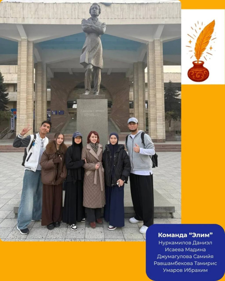 Команда «Элим» стала единственным представителем Кыргызстана, пробившимся в 1/16 финала среди 264 команд из стран ближнего зарубежья. Теперь студенты достойно представляют страну на международном этапе чемпионата. Наставником команды является старший преподаватель кафедры русской филологии О. П. Улыбышева.