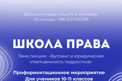 в осеннем и весеннем семестрах постоянно действовала Школа права, организованная деканатом совместно с кафедрами и Студенческим советом факультета. В течение 2022-2023 учебного года около 200 школьников г. Бишкека и пригородных районов приняли активное участие в программах Школы права. В рамках совместного выезда с представителями других факультетов юридический факультет посетил в феврале-мае 2023 г. средние школы Чуйской области (гг. Кара-Балта, Кант, с. Беловодское и с. Ленинское), где преподаватели и студенты ознакомили учащихся старших классов (до 800 школьников) с направлениями подготовки и учебным процессом на юридическом факультете. Студенты юридического факультета совместно с участниками проекта «Жаш муун 2023» провели профориентационную работу со учащимися (более 300 школьников) в Ошской области (Кара-Кульджинский район).