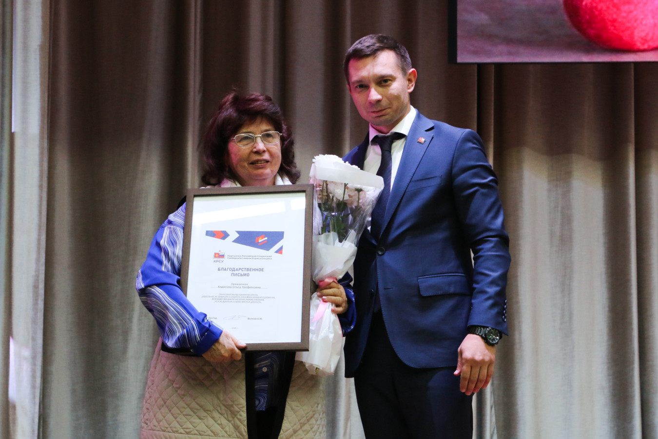 «Что может быть важнее для учителя, чем видеть успехи своих учеников — их победы на олимпиадах, достижения в науке и творчестве, лидерские качества. Учитель — это как мама: у каждого есть мама и есть учитель. Именно вы дарите детям путёвку в жизнь, формируете их образованность, воспитанность и целеустремлённость. Мы гордимся нашими школьниками и рады, что половина выпускников нашей школы поступает в КРСУ».