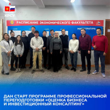 С 12 ноября на экономическом факультете начались занятия по программе профессиональной переподготовки «Оценка бизнеса и инвестиционный консалтинг», реализуемой под руководством к.э.н., доцента Краснова А.Ю. Это первая встреча слушателей и начало освоения компетенций в области оценочной деятельности.